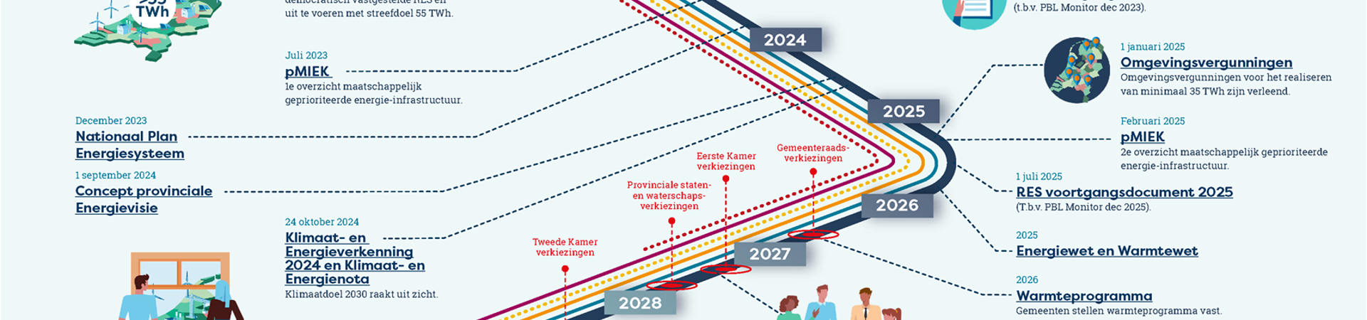 Het Nationaal Programma RES (NP RES) publiceert twee keer per jaar een 'foto' die inzicht geeft in waar de regio’s staan in het proces richting 2030. De tijdlijn "RES op weg naar 2030-2050" toont de planning en belangrijke mijlpalen van de RES tot aan 2050.